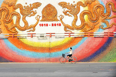 Thời tiết Hà Nội chuyển nắng nóng khoảng hai ngày nay. Người phụ nữ vừa đạp xe vừa lấy tay che đầu khi đi ngang qua bức tường gốm sứ dưới chân cầu Chương Dương.