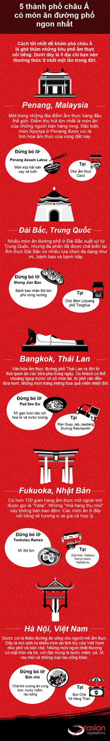 Theo bình chọn của trang Asian Inspiration, 4 thành phố các có tên trong danh sách gồm Penang, Đài Bắc, Bangkok và Fukuoka.