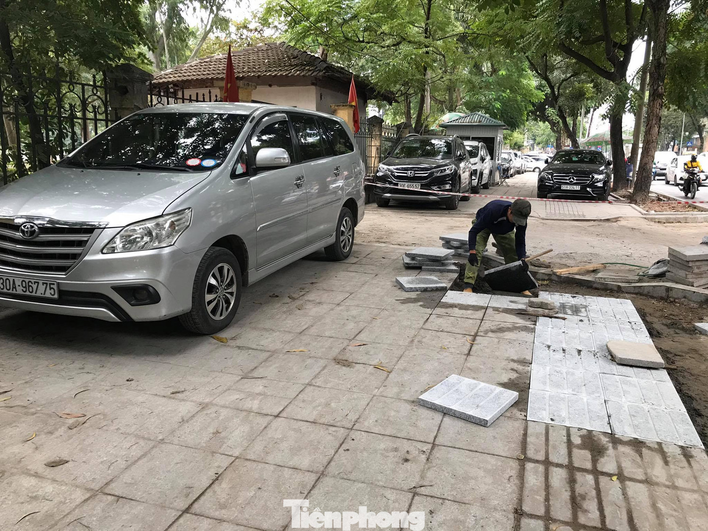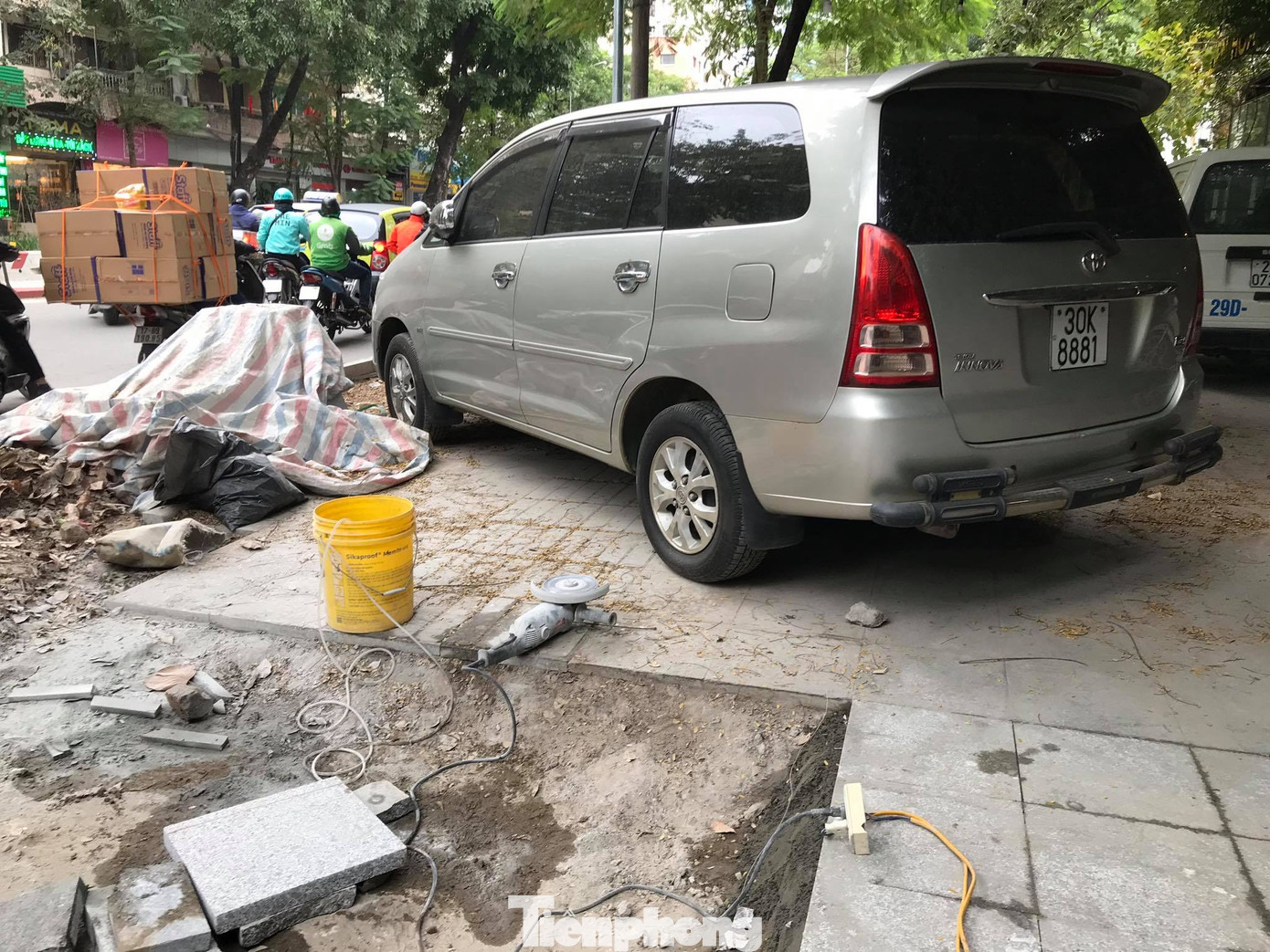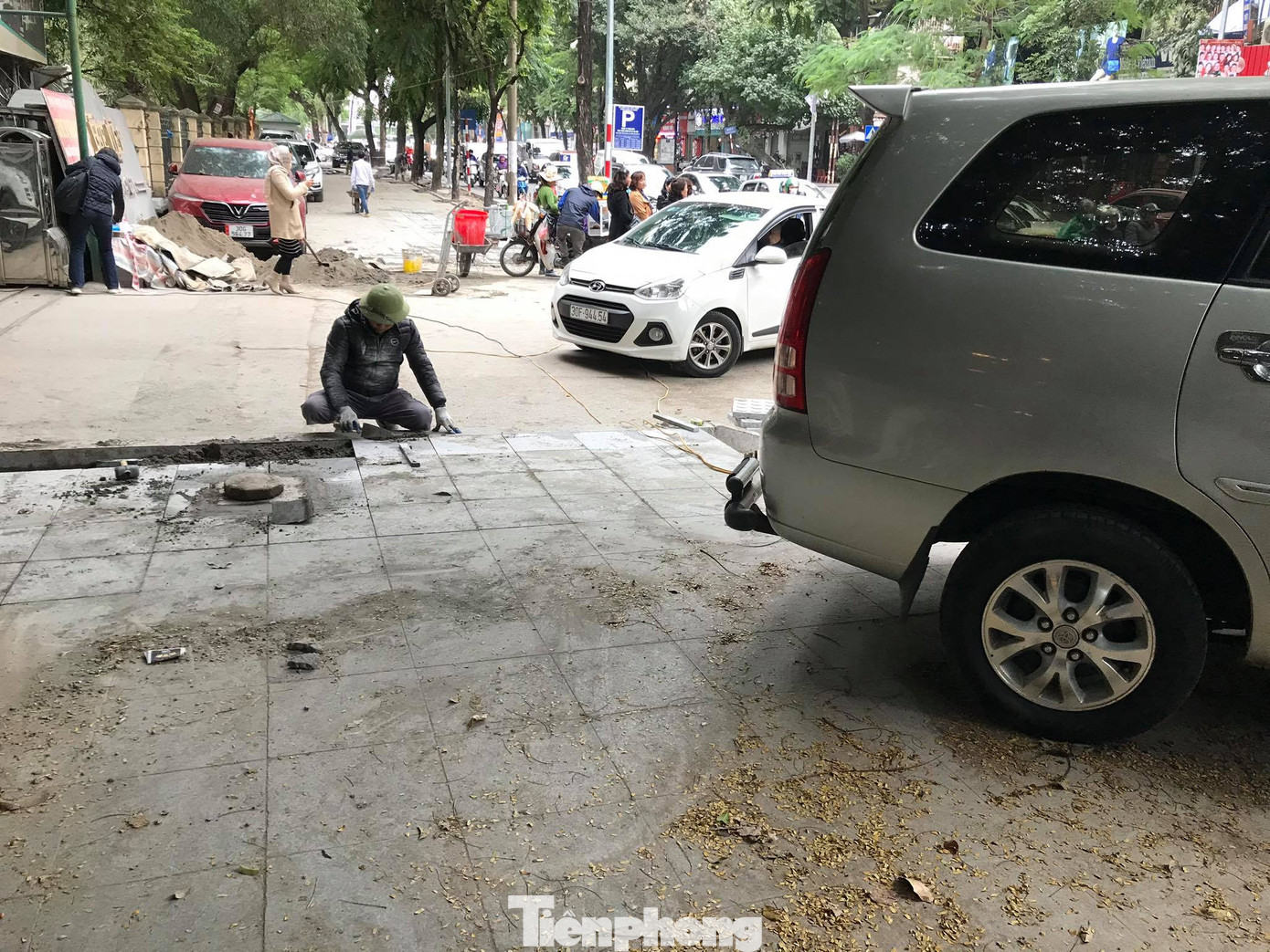 Nhiều công nhân vẫn thi công bên cạnh những chiếc ô tô "chễm trệ" đỗ trên vỉa hè vừa lát