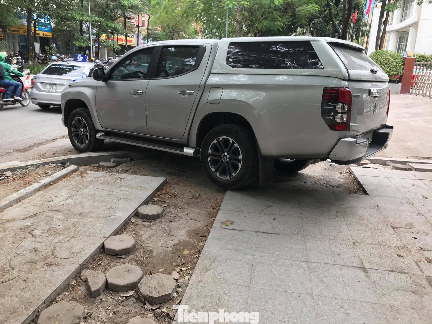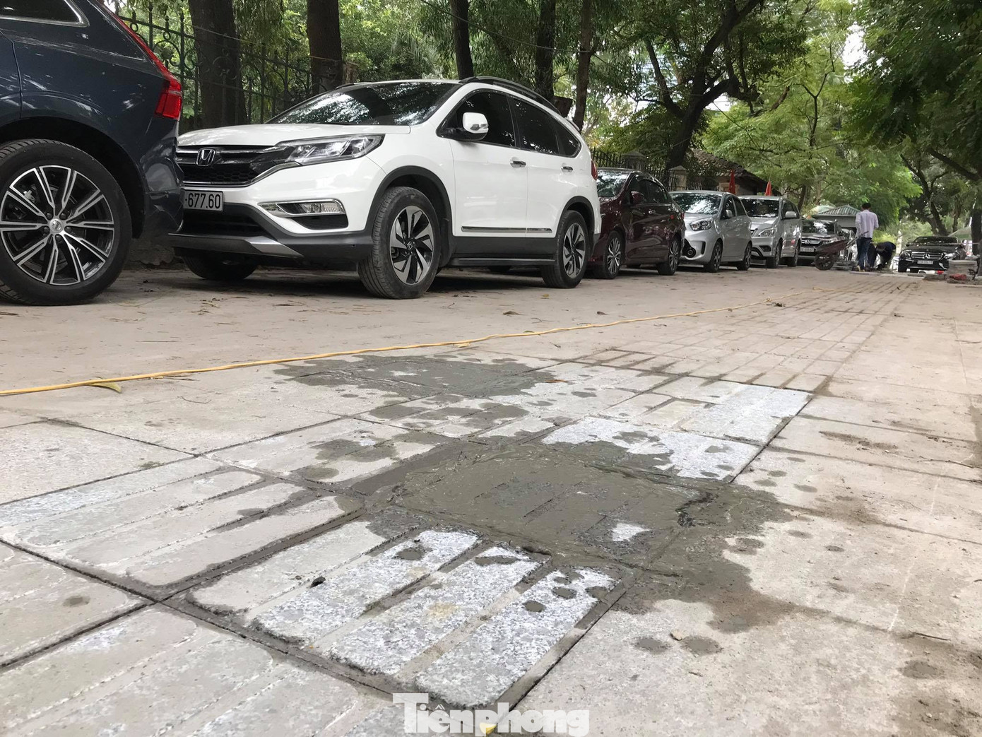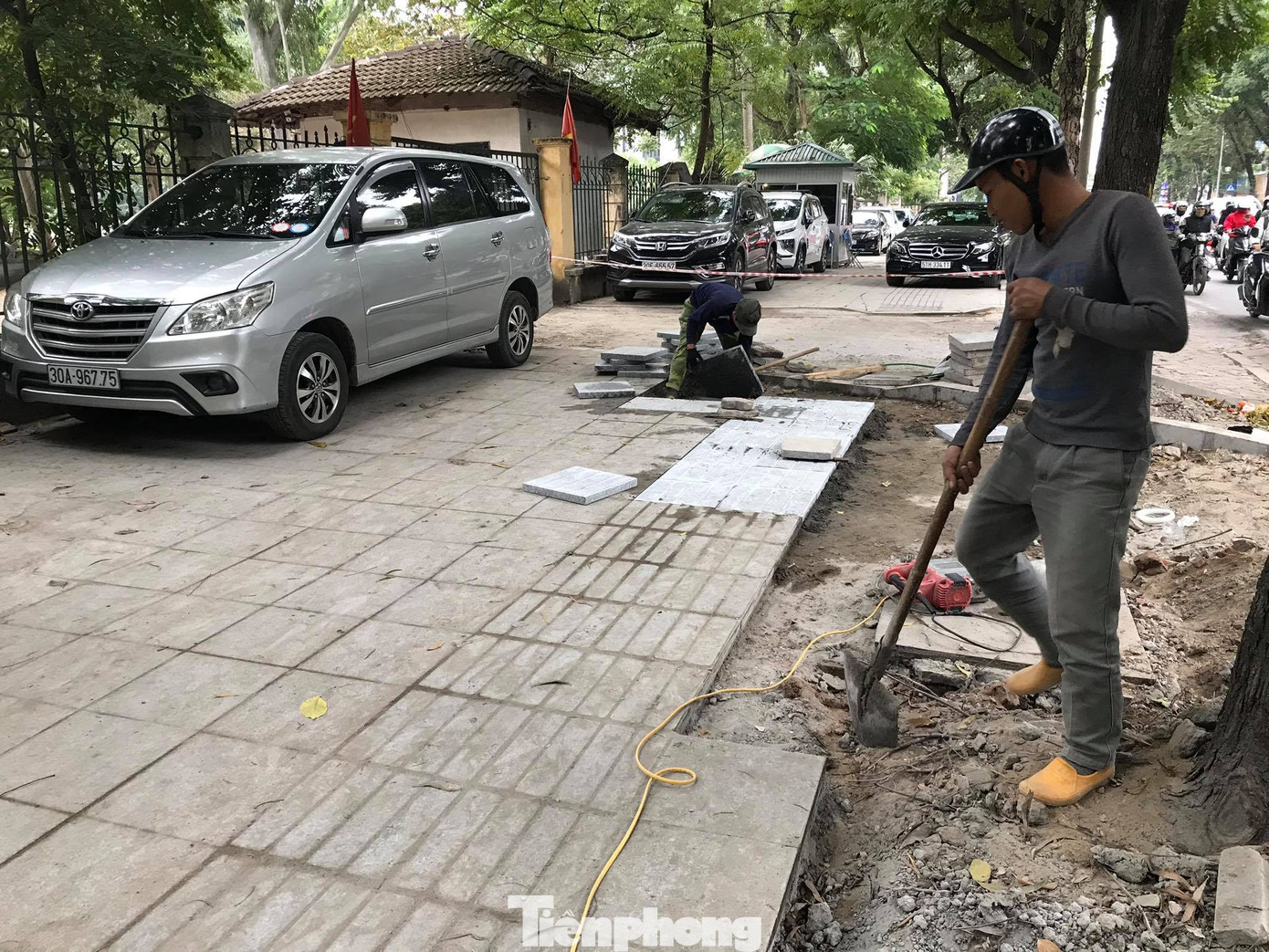 Nhiều công nhân vẫn thi công bên cạnh những chiếc ô tô "chễm trệ" đỗ trên vỉa hè vừa lát