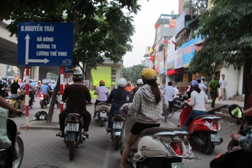 Vào giờ cao điểm, đường Khuất Duy Tiến thường xuyên ùn tắc, người dân phải đi xe máy lên cả vỉa hè.