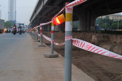Rào chắn thi công có đèn báo sáng phân luồng cho các đơn vị làm vào ban đêm.