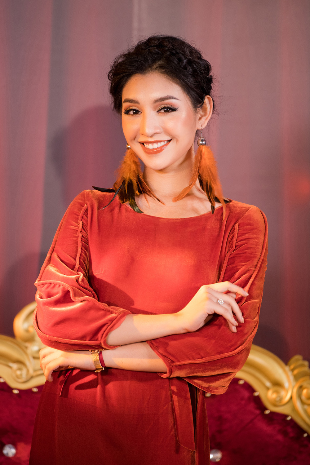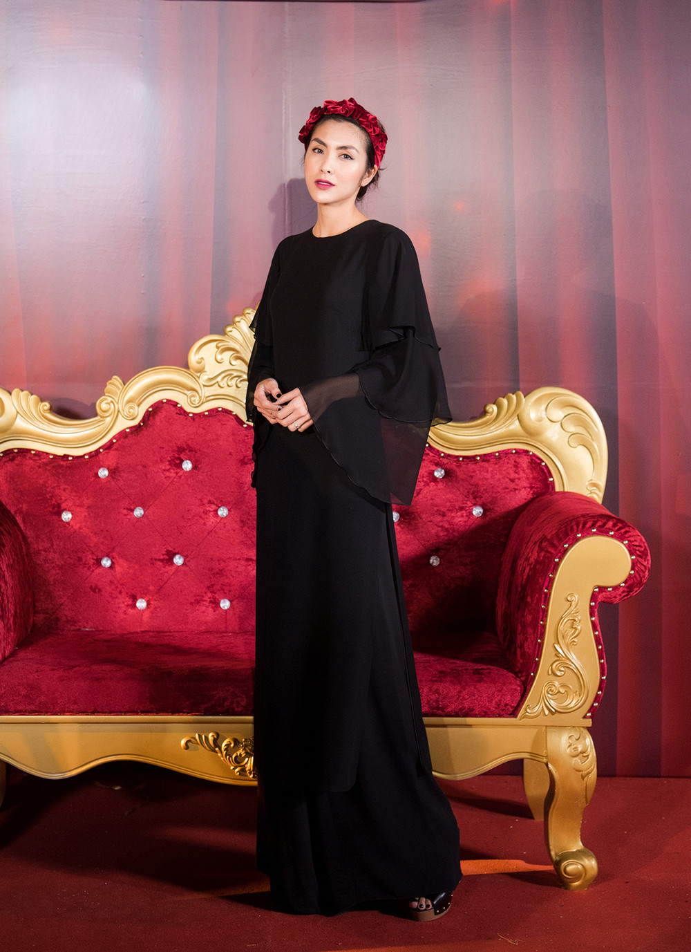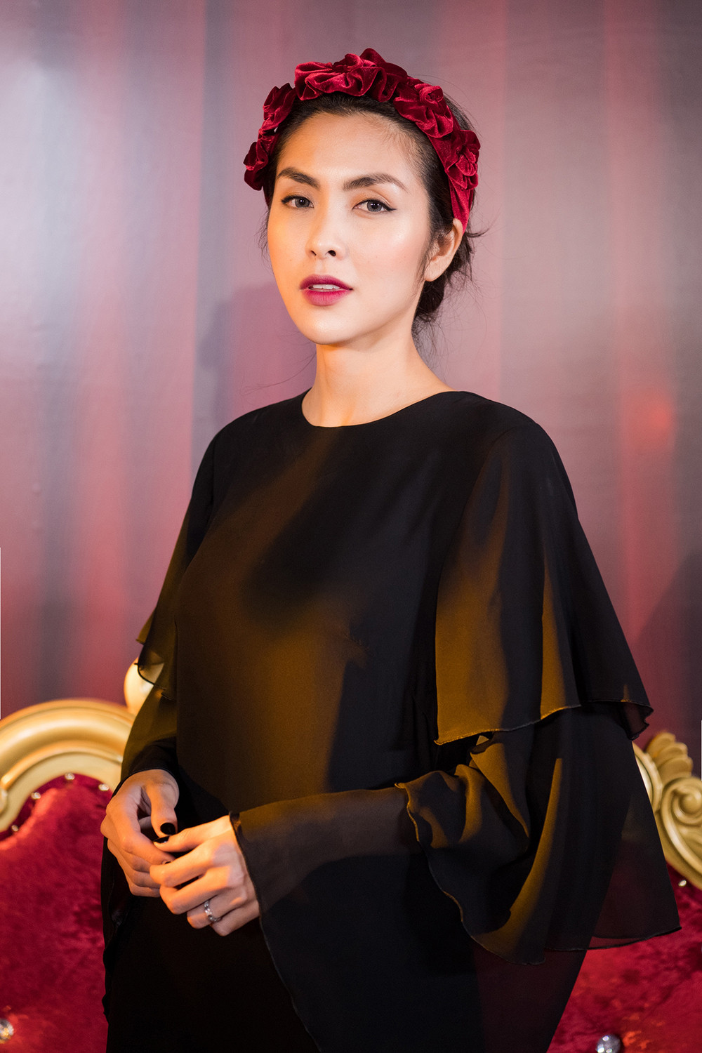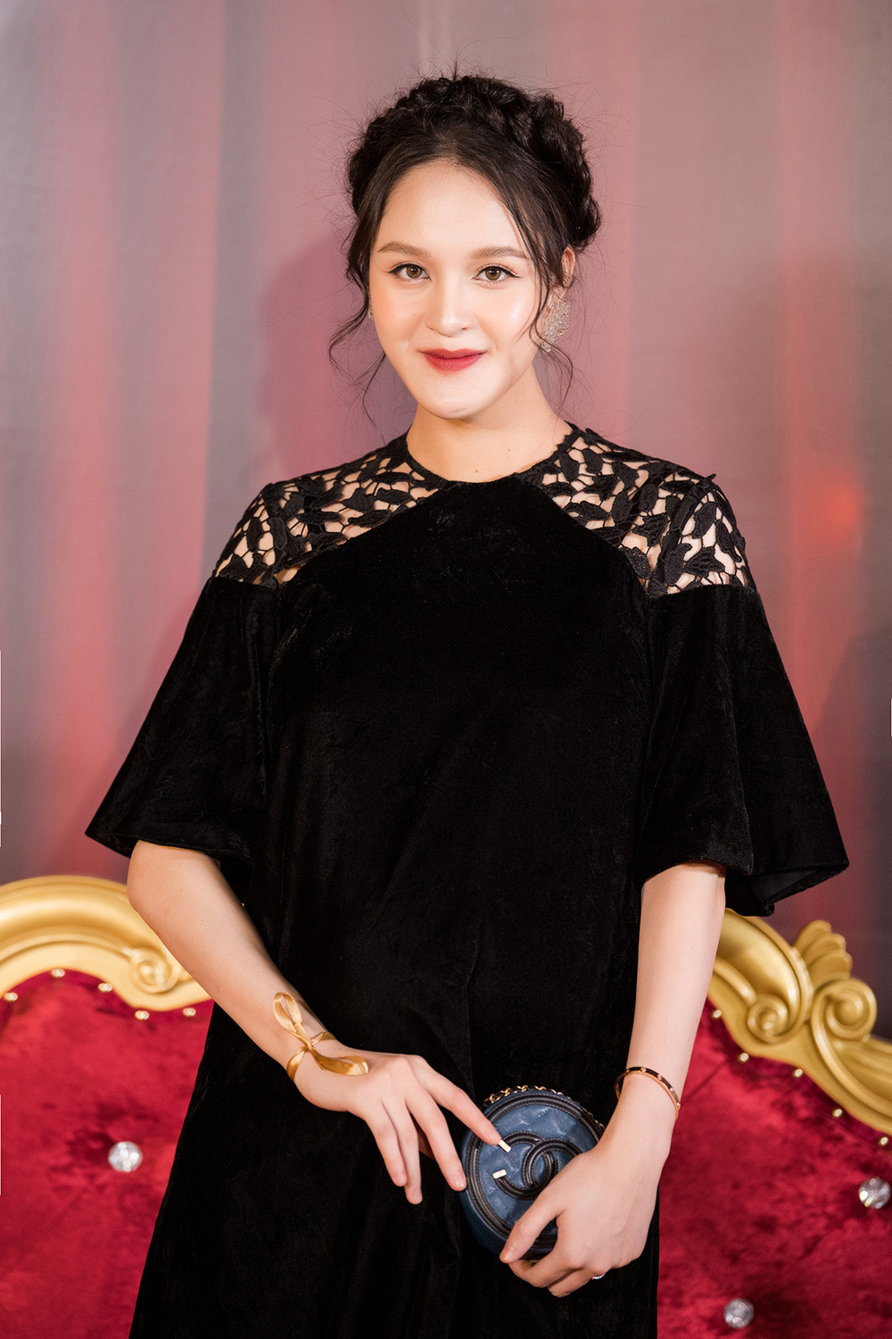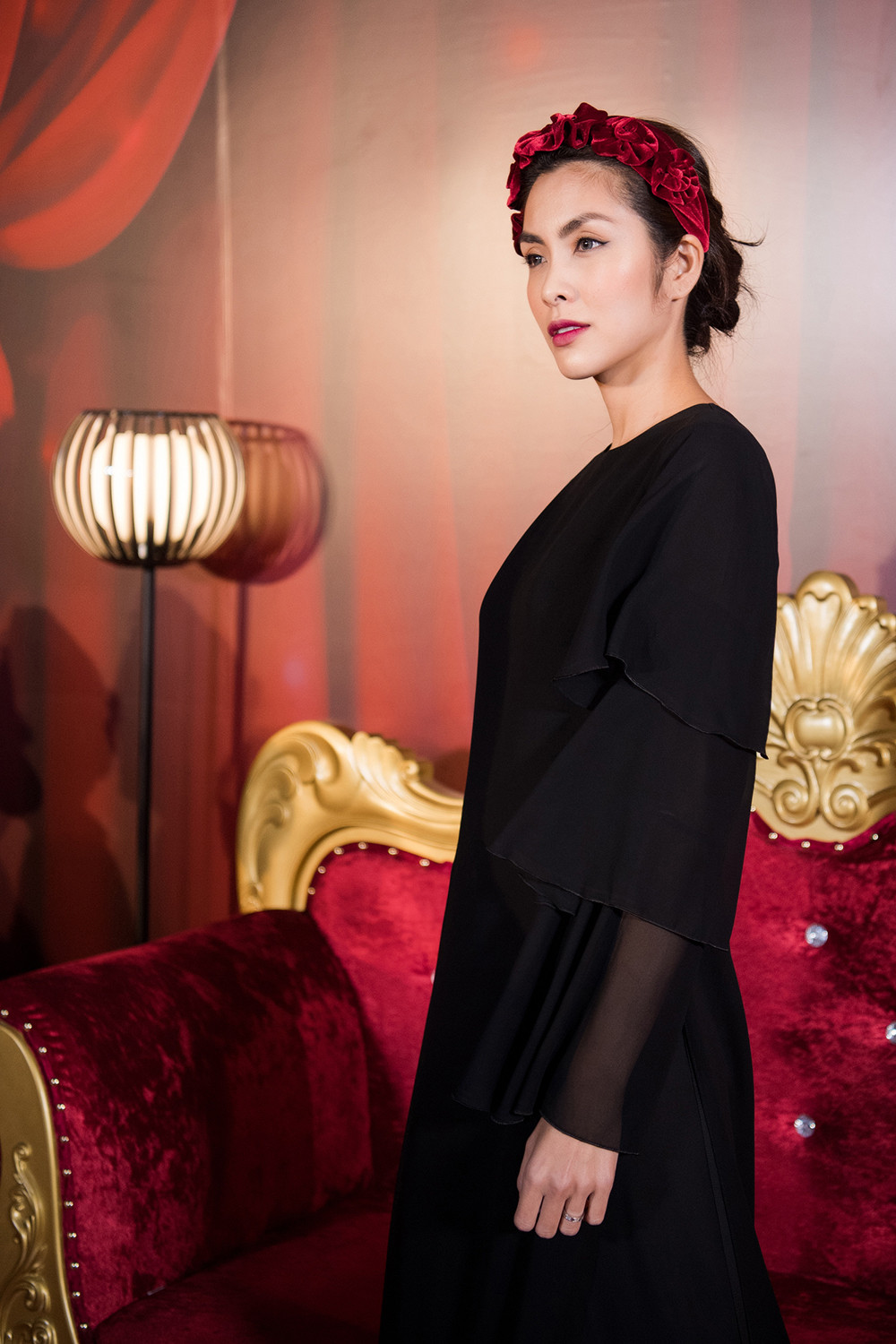 Nữ diễn viên kết hợp với mấn đội đầu màu nhung đỏ mang lại vẻ kiêu sa, bí ẩn. Nữ diễn viên có vẻ gày hơn trước, cô chia sẻ thời gian gần đây bị dạ dày nên ăn uống không được tốt lắm khiến cân nặng có giảm chút ít.
