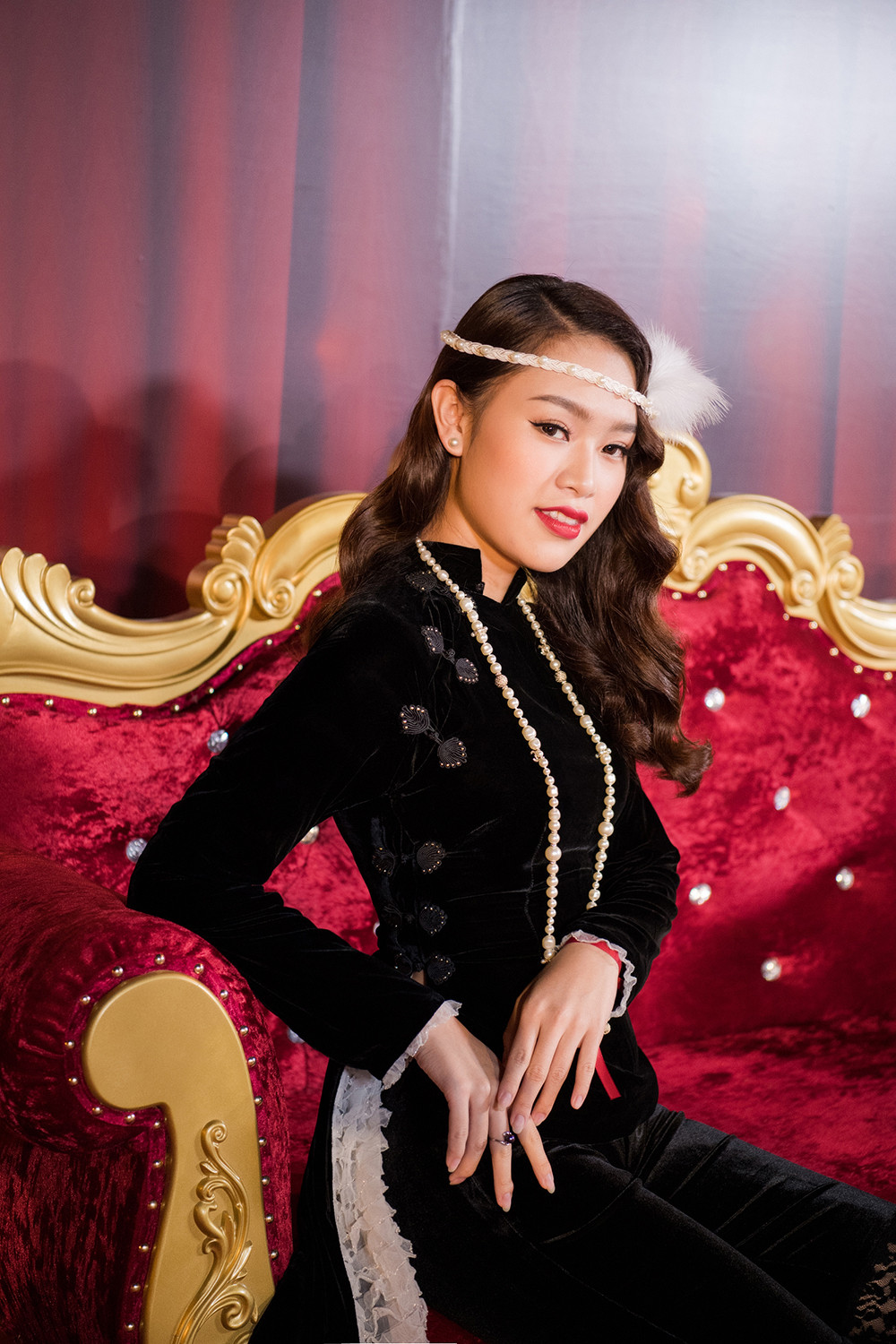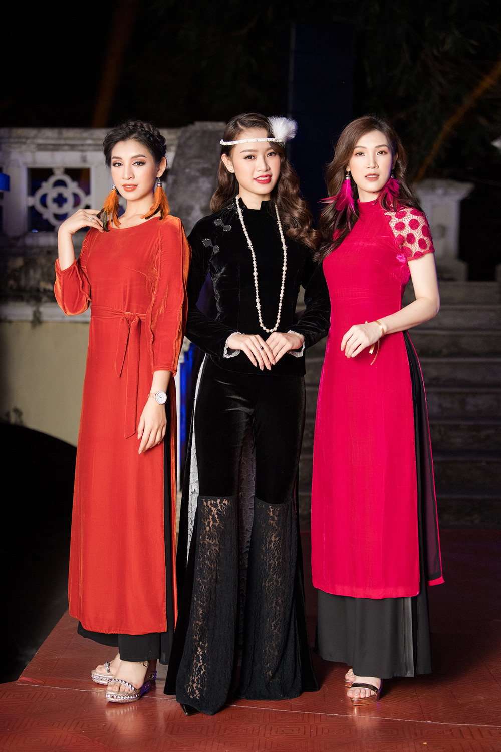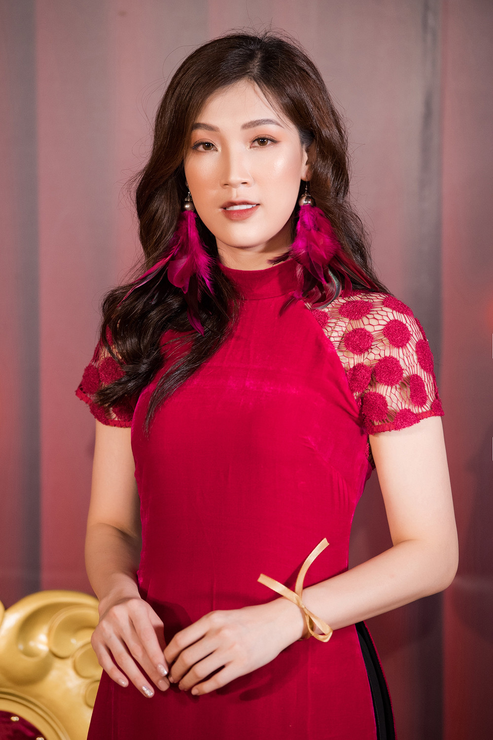 Hoa hậu Dương Thuỳ Linh diện áo dài nhung đỏ với phần cầu vai cách điệu bằng tua rua màu đen độc đáo. Cô chọn phong cách trang điểm nhẹ nhàng, tóc uốn xoăn nhẹ thanh lịch.