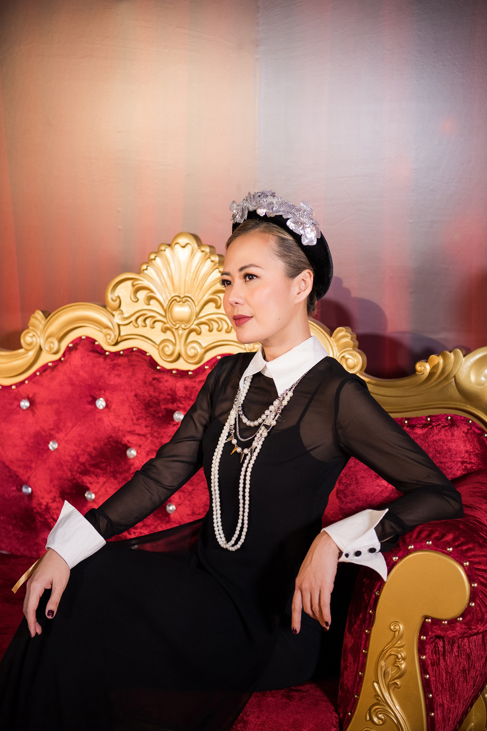 MC Bùi Việt Hà diện bộ áo dài với chất liệu voan đen xuyên thấu vừa cổ điển mà cũng rất hiện đại. Cô sử dụng phụ kiện mấn đội đầu đính cườm cầu kỳ, tinh xảo.