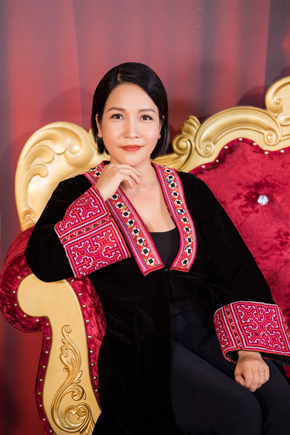 Ca sĩ Mỹ Linh giản dị trên thảm đỏ với bộ váy nhấn nhá hoạ tiết thổ cẩm.