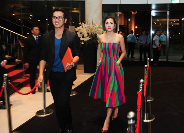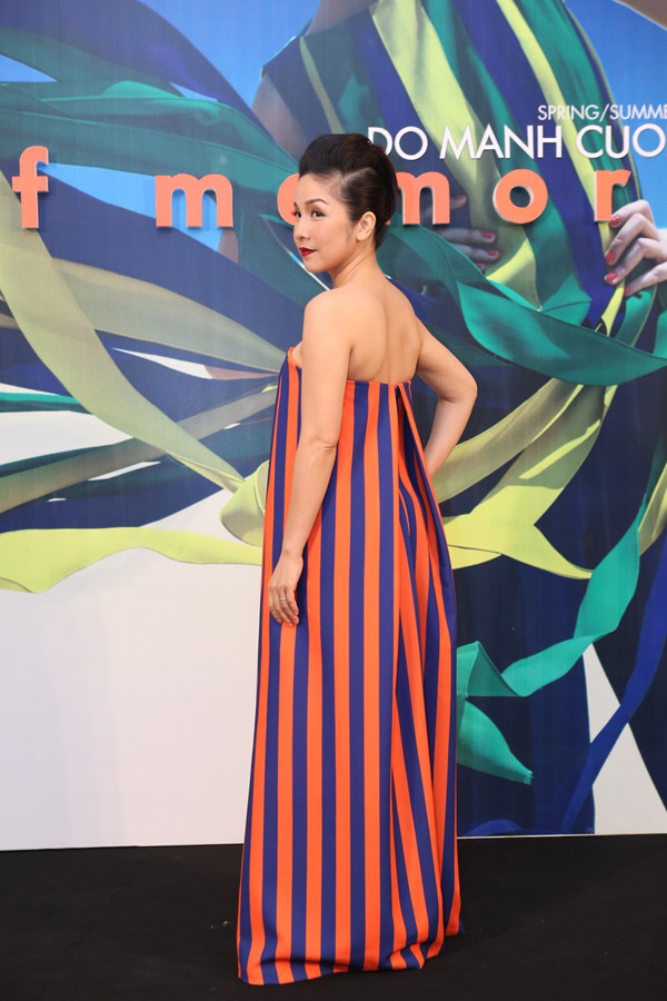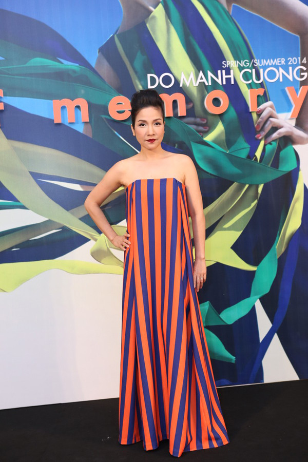 Tối qua, Hà Tăng cũng diện một mẫu váy họa tiết kẻ sọc đặc trưng của Đỗ Mạnh Cường để tới xem show của anh.