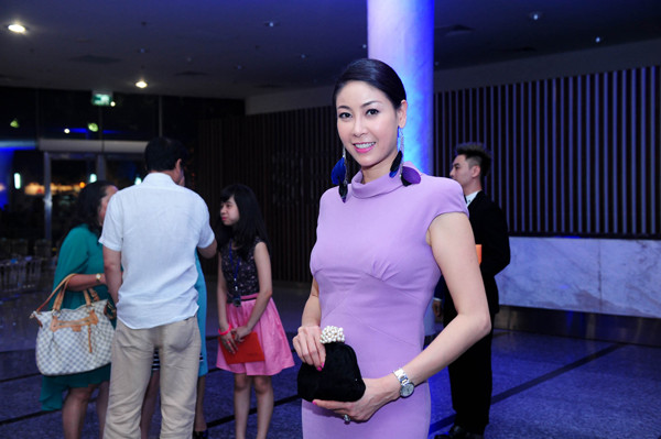 cô diện bộ váy màu tím khoe nét sang trọng, thanh lịch.