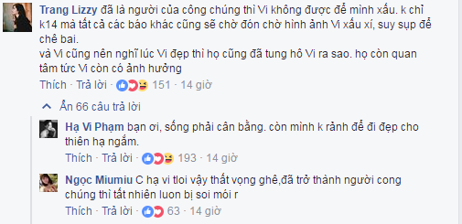 Không dừng lại ở đó, Hạ Vi còn sẵn sàng đáp trả và đôi co với người hâm mộ. Cụ thể, một tài khoản có tên Trang Lizzy bình luận: “Đã là người của công chúng thì Vi không được để mình xấu… Vi cũng nên nghĩ lúc Vi đẹp thì họ cũng đã tung hô Vi ra sao? Họ còn quan tâm tức Vi còn có ảnh hưởng”. Hạ Vi cho rằng cô không rảnh để đẹp cho thiên hạ ngắm. Quan điểm thẳng thắn của Hạ Vi một lần nữa khiến nhiều người không khỏi thất vọng.