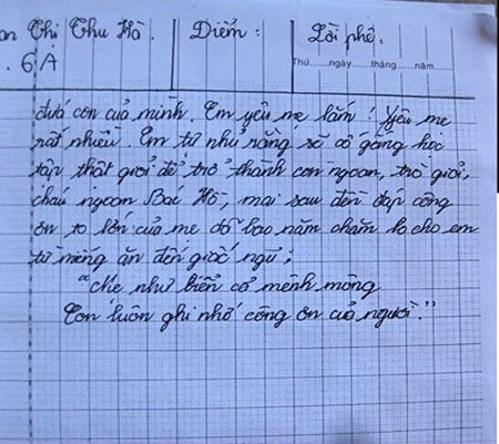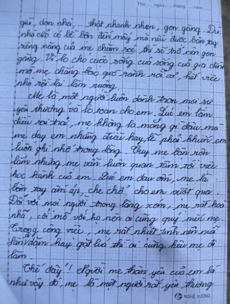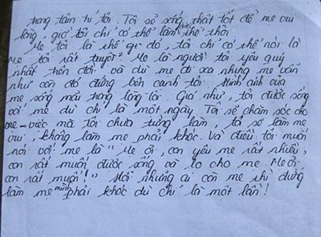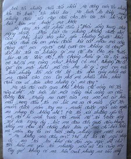 Mẹ tôi là người thế đó, tôi chỉ có thể nói là mẹ tôi rất tuyệt. Mẹ là người tôi yêu quý nhất trên đời và dù me đi xa nhưng mẹ vẫn như còn đó đứng bên cạnh tôi. Giá như, tôi được sống với mẹ dù chỉ là một ngày. tôi sẽ chăm sóc cho mẹ, việc mà tôi chưa từng làm, tôi sẽ làm mẹ vui, không làm mẹ phải khóc. Và điều tôi muốn nói với mẹ là “Mẹ ơi! Con yêu mẹ rất nhiều, con rất muốn được sống và lo cho mẹ. Mẹ ơi! Con rất muốn”.