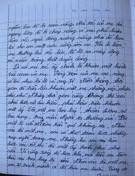 Nhưng thời gian cũng không thể xóa nhòa được nét dịu hiền, phúc hậu trên khuôn mặt ấy. Đôi mắt mẹ đen láy thấm đượm sự bao dung, trìu mến. Người ta thường nói “Đôi mắt là cửa sổ của tâm hồn” quả là không sai. Nhìn vào đôi mắt mẹ, em có thể đoán được những suy nghĩ trong mẹ. Những lúc em làm được việc tốt đôi mắt ấy hạnh phúc như cười. Và cũng từng đỏ hoe khi mỗi lần em làm điều sai trái. Nhìn vào đôi mắt mẹ, em tự trách mình vì đã làm mẹ buồn. Cùng với đôi mắt mẹ là cặp lông mi dài và đôi chân mày lá liễu dày. Mũi mẹ cao cao, cái miệng nho nhỏ, khi cười để lộ hàm răng trắng, đều như hạt bắp.
