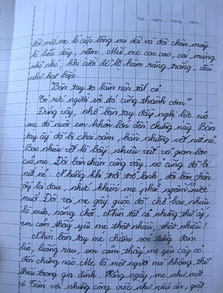 Đúng vậy! nhờ có bàn tay đầy nghị lực của mẹ đã nuôi em khôn lốn đến chừng này. Bàn tay ấy đã bị bao sậm, hằn những vết nứt nẻ. Bao nhiêu vết là bấy nhiêu vất vả gian lao của mẹ. Đôi bàn chân cũng vậy, nó cũng đã bị nứt nẻ. Những khi trời trở lạnh, đôi bàn chân ấy lại đau, nhức khiến mẹ phải ngâm vào nước muối. Đôi vai mẹ gầy gộc đã trở bao nhiêu là mưa nắng. Nhìn tất cả những thứ ấy em cảm thấy yêu mẹ thật nhiều, thật nhiều.