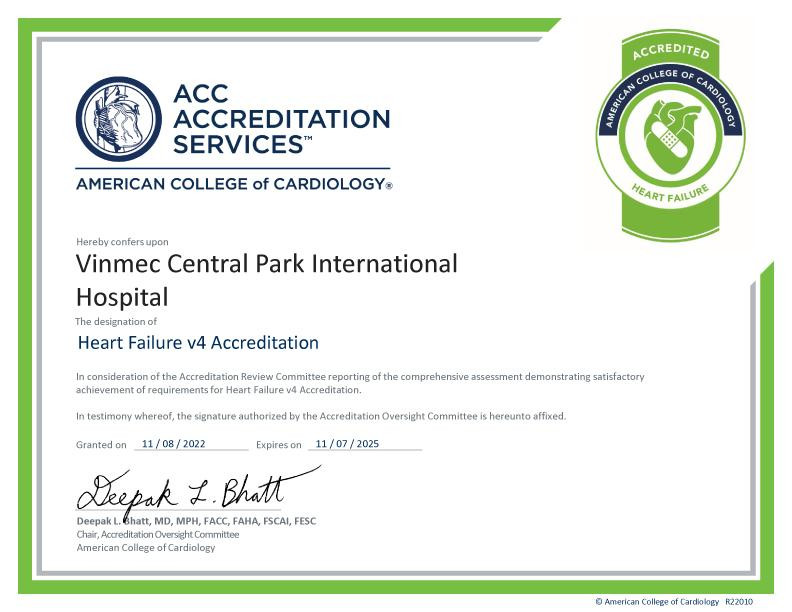 Chứng nhận của American College of Cardiology (ACC) là tiêu chuẩn hàng đầu về quản lý và điều trị các bệnh lý tim mạch, được công nhận trên khắp thế giới với các tiêu chí đánh giá nghiêm ngặt và toàn diện. Sau hơn một năm triển khai thực hiện bộ quy trình quản lý suy tim được xây dựng, chuẩn hóa và cập nhật theo các tiêu chuẩn của ACC, hai Trung tâm Tim mạch thuộc Vinmec Times City (Hà Nội) và Vinmec Central Park (TP. HCM) đã được Hội đồng thẩm định ACC công nhận đạt chuẩn về chương trình quản lý suy tim.