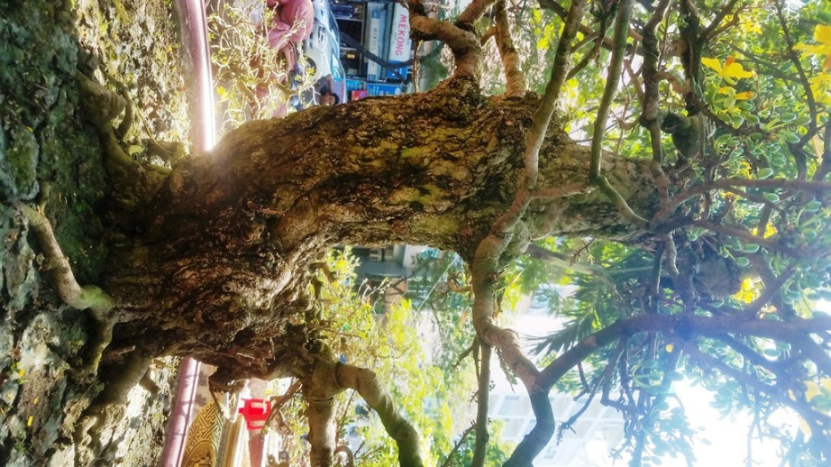 Với tuổi đời khoảng 200 năm, "cụ" mai có gốc sần sùi.