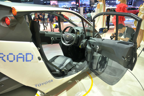 Một chiếc xe khác cũng rất thu hút sự tò mò của người xem có tên là i-Road. Đây là mẫu điện có xeý tưởng sử dụng động cơ điện thể hiện “Chuyển động đô thị trong tương lai"