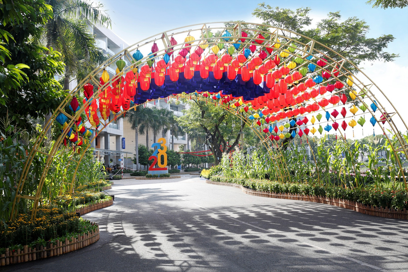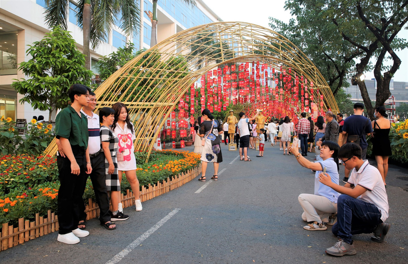 Các tiểu cảnh trên đồi cây xanh phía tay phải của trục hồ dài là những thảm hoa rực rỡ với các mô hình kết hoa, lá và cây xanh tạo thành khu vườn Xuân sinh động nhiều màu sắc của ngày Tết cổ truyền. Khu vực bồn biểu tượng với hình ảnh những chú mèo đang biểu diễn điệu nhảy như thể hiện sự thành công, vui vẻ của năm 2023 và hướng đến thành công của những năm kế tiếp…