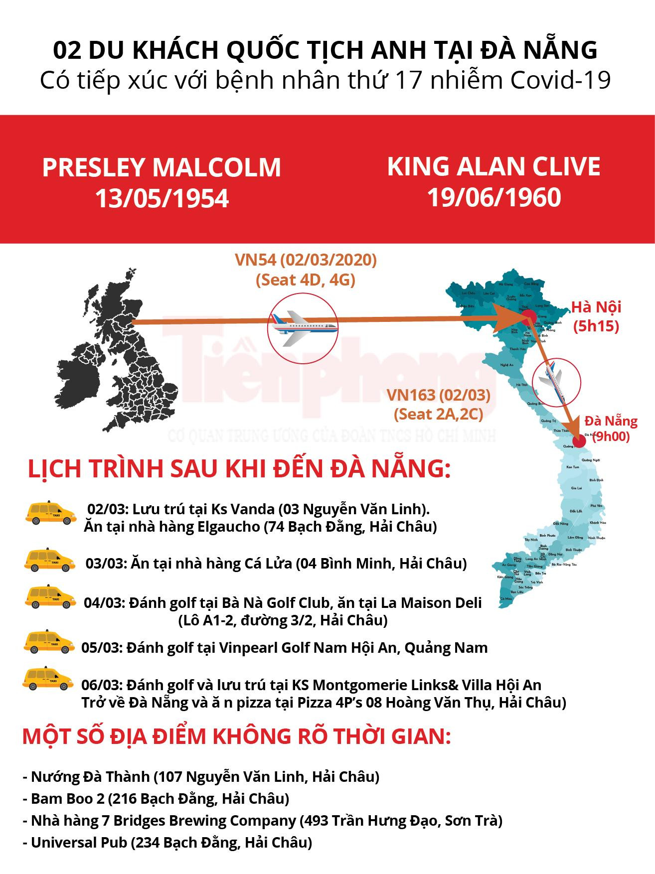 Ngoài ra, trong thời gian lưu trú tại Đà Nẵng, 02 người này có đến các địa điểm: Nhà hàng Nướng Đà Thành (107 Nguyễn Văn Linh, phường Nam Dương, quận Hải Châu); Bamboo 2 bar (216 Bạch Đằng, phường Phước Ninh, quận Hải Châu); Nhà hàng 7 Bridges Brewing Company (493 Trần Hưng Đạo, phường An Hải Tây, quận Sơn Trà); Universal Pub (234 Bạch Đằng, phường Phước Ninh, quận Hải Châu).