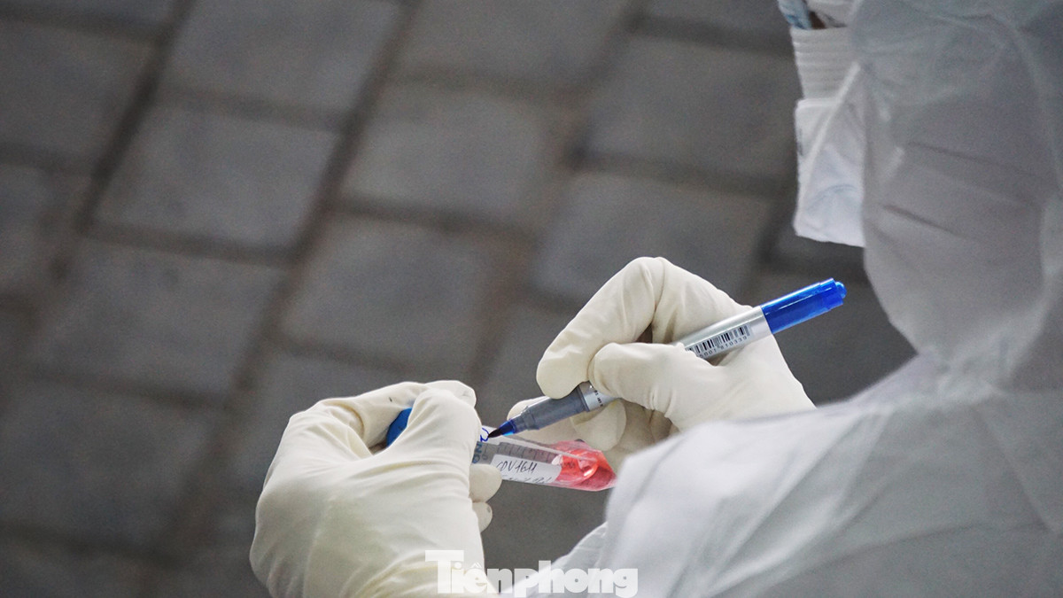 Sau khi khai báo y tế, thông tin cá nhân, cán bộ y tế thuộc CDC Hải Dương sẽ ghi tên, thông tin từng người lên ống chứa mẫu dung dịch.