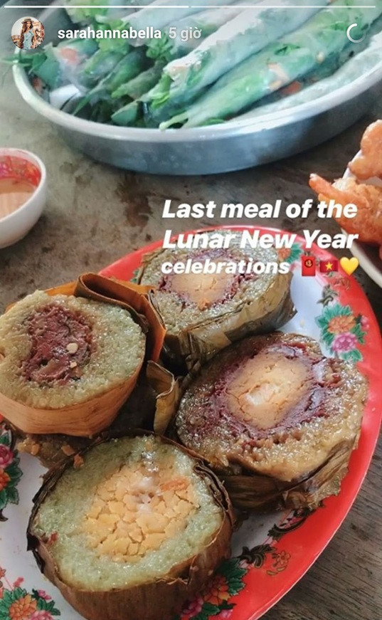 Trở về Việt Nam cùng với cha mẹ và em trai trong dịp Tết cổ truyền, hot girl 22 tuổi tỏ ra khá hào hứng khi được đến thăm, chúc Tết người thân và thưởng thức các món ăn truyền thống như bánh chưng, dưa hành, thịt gà...