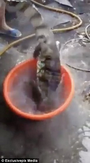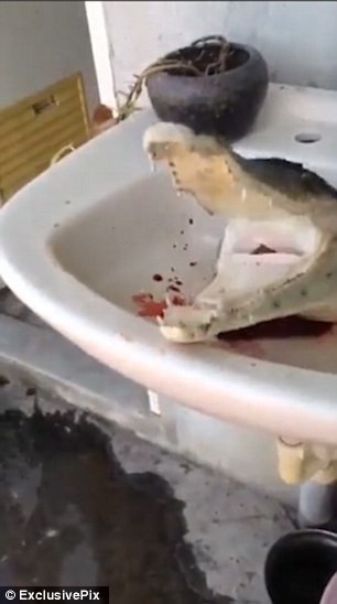 Con cá sấu tội nghiệp đã bị lôi lên khỏi mặt nước rồi cắt đầu. Phần đầu của con cá sấu được đặt trong một chiếc chậu rửa mặt, còn phần thân nằm chỏng chơ trong một chiếc chậu nhựa lớn.
