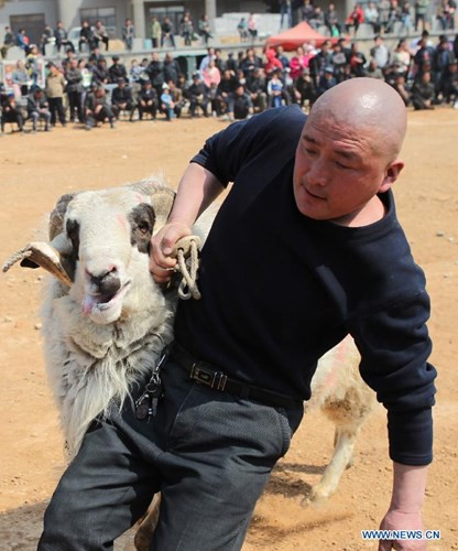 Một người đàn ông đang kéo con cừu của mình vào tham gia trận đấu chọi cừu ở tỉnh Sơn Đông.