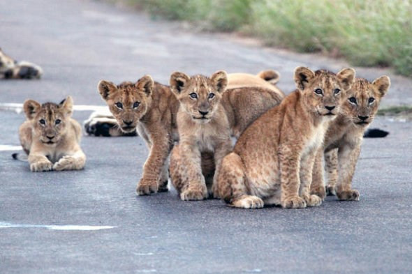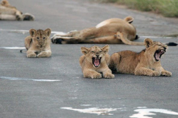 Khi trời sáng, một vài con sư tử con thức giấc và chơi đùa với nhau, còn nhiều con khác vẫn lăn ra ngủ giữa đường.