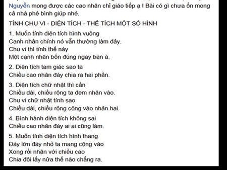 Thời gian gần đây, Facebook của nhóm “Chúng tôi yêu giáo dục tiểu học” xôn xao và thích thú với bài thơ về tính chu vi, diện tích, thể tích các hình ở bậc tiểu học.