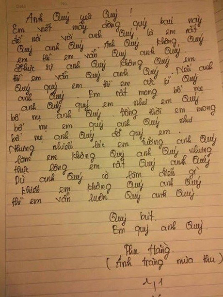 Cư dân mạng đang chia sẻ một bức thư tình thú vị được cô gái tên Thu Hằng gửi tới chàng trai tên Quý. Trong lá thư này, người viết cố ý nhắc tới chữ "quý" tới 39, khiến người đọc hoa mắt chóng mặt, không phân biệt nổi đâu là danh từ, đâu là động từ nữa.
