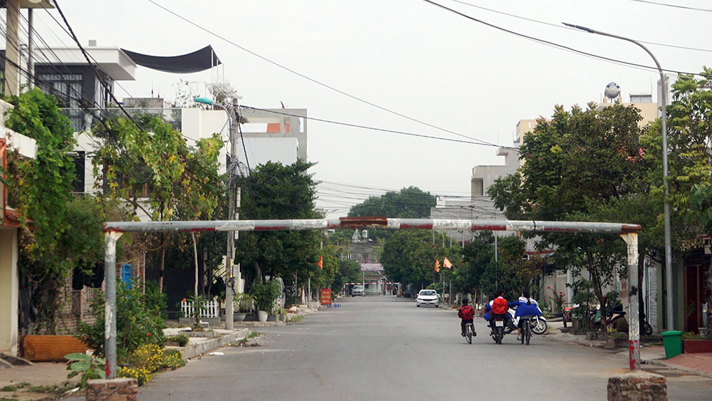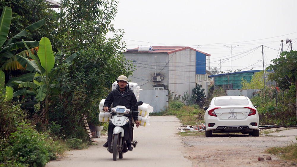 Khu vực Đồng Xá được dựng rào chắn ngăn chặn xe tải chở vật liệu xây dựng vào thi công xây trái phép.