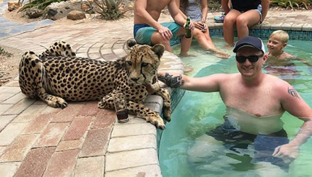 Du khách bạo gan vuốt ve báo gấm bên bể bơi (XEM VIDEO)