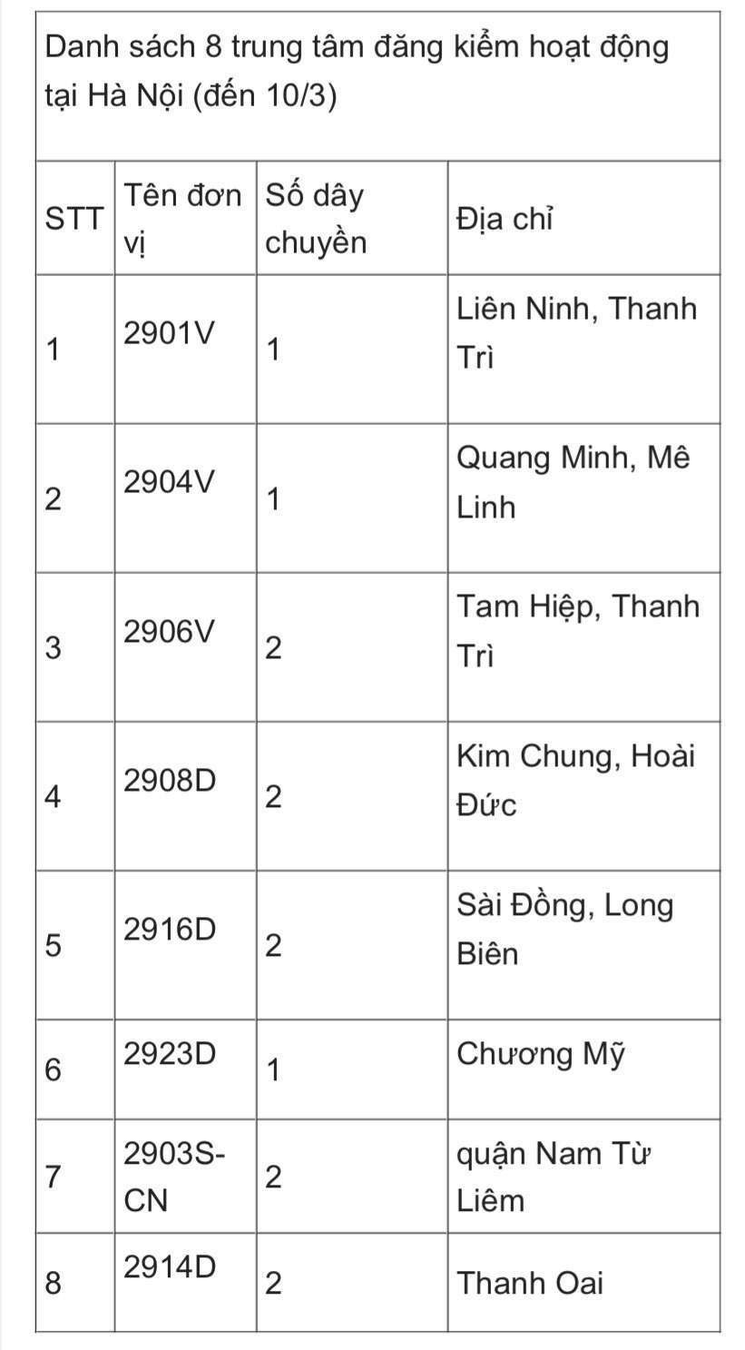 2 trung tâm đăng kiểm được hoạt động trở lại gồm: Trung tâm đăng kiểm số 2903S – Mỹ Đình (quận Nam Từ Liêm), Trung tâm đăng kiểm 2914 - Khu công nghiệp Thanh Oai (huyện Thanh Oai).