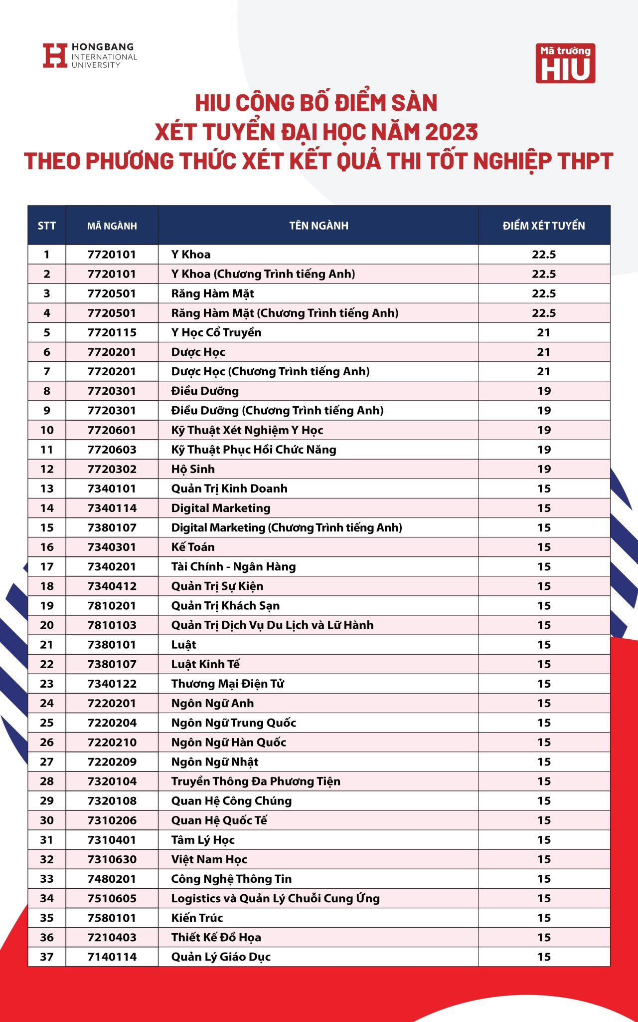 Cụ thể, tại Trường ĐH Quốc tế Hồng Bàng điểm sàn năm 2023 dành cho các ngành khối sức khỏe dao động từ 19 - 22,5 điểm. Ngành có điểm sàn cao nhất là ngành Y đa khoa và Răng Hàm Mặt là 22,5 điểm.