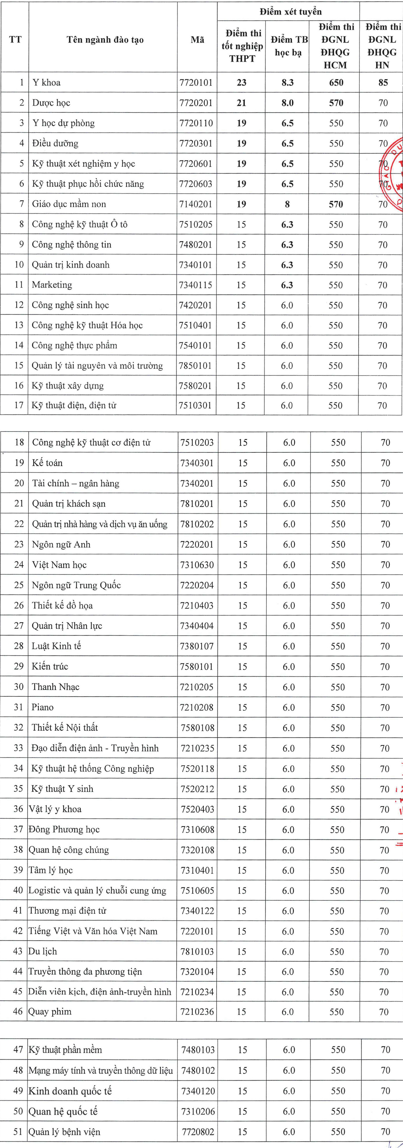 Đối với xét tuyển học bạ tại Trường ĐH Nguyễn Tất Thành, thí sinh cần đạt tối thiểu mức điểm sàn mà Nhà trường đã công bố: Ngành Y khoa là 8,3; Ngành Dược và Giáo dục mần non là 8,0; Ngành Y học dự phòng, Điều dưỡng, Kỹ thuật xét nghiệm y học, Kỹ thuật Phục hồi chức năng là 6,5; Công nghệ Kỹ thuật ô tô, Công nghệ thông tin, Quản trị kinh doanh và Marketing là 6.3 điểm.