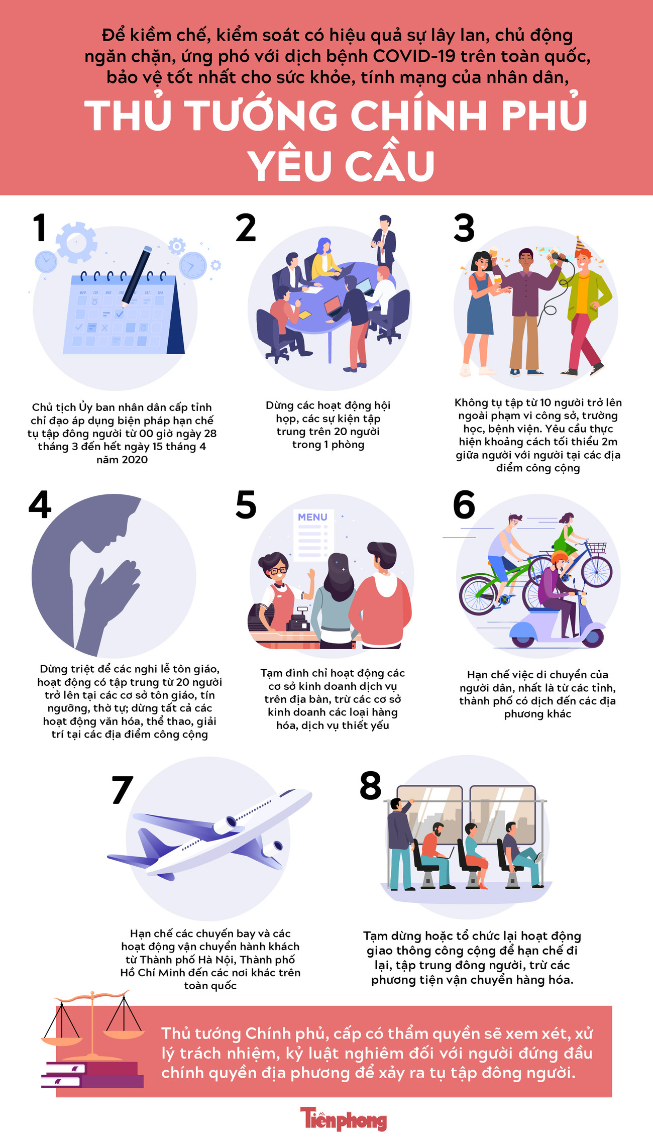 TPO - Thủ tướng Chính phủ yêu cầu Bộ Giao thông vận tải chỉ đạo hạn chế các chuyến bay và các hoạt động vận chuyển hành khách từ Thành phố Hà Nội, Thành phố Hồ Chí Minh đến các nơi khác trên toàn quốc. Tạm dừng hoặc tổ chức lại hoạt động giao thông công cộng để hạn chế đi lại, tập trung đông người, trừ các phương tiện vận chuyển hàng hóa.