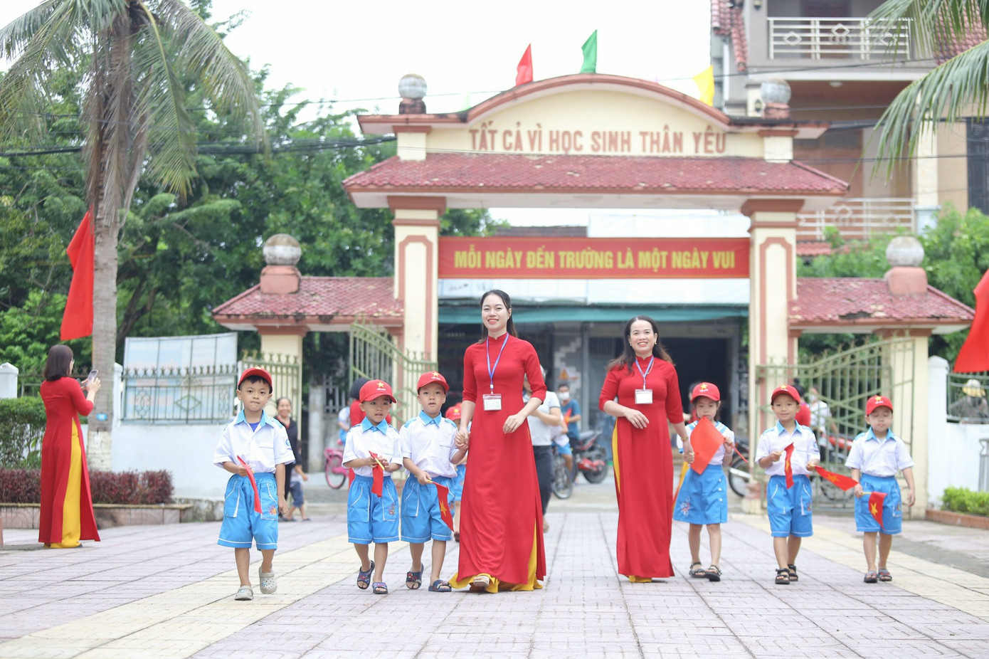 | Các cô giáo thướt tha trong tà áo dài truyền thống nắm tay các em vào trường, đeo khăn quàng đỏ cho học sinh trong ngày khai giảng. |