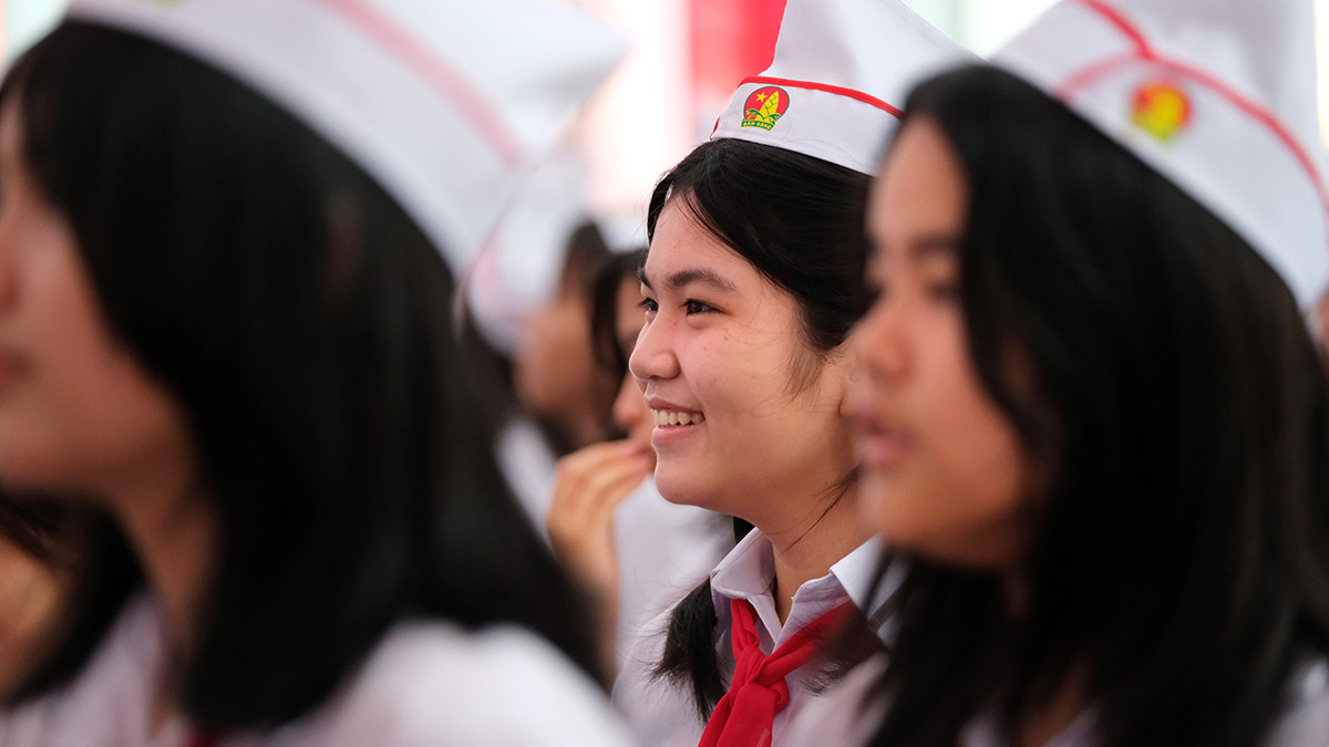| Học sinh Trường THPT chuyên Trần Phú Hải Phòng dự lễ khai giảng năm học mới. |