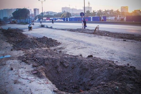 Hố trồng cây xanh mới sâu khoảng 0,6m xuất hiện dọc hai bên đoạn đường bê tông mới hoàn thành.