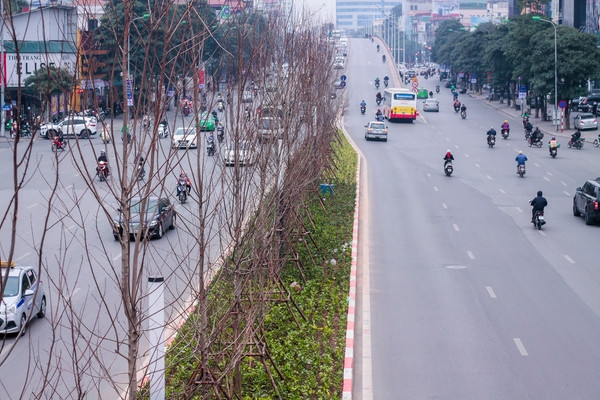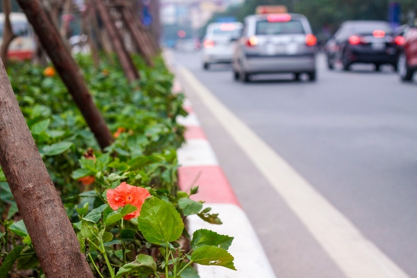 Trên dải phân cách đường Nguyễn Chí Thanh, Trần Duy Hưng xuất hiệu các loài hoa như hoa dâm bụt, hoa bạch trinh, hoa lài, hoa bông trang...