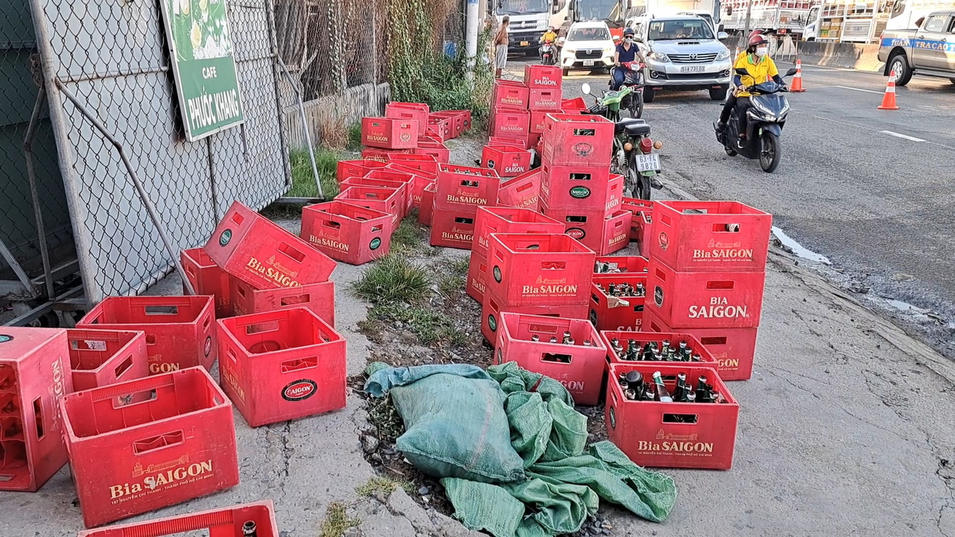 Tại hiện trường, nhiều két bia và mảnh vỡ chai bia văng tung tóe khắp mặt đường, khiến hàng loạt phương tiện các loại di chuyển ngang qua phải né tránh nên gặp rất nhiều khó khăn.