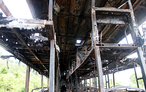 Xe giường nằm cháy trơ khung, hành khách được đưa lên ôtô khác tiếp tục hành trình. Ảnh: Xuân Ngọc.