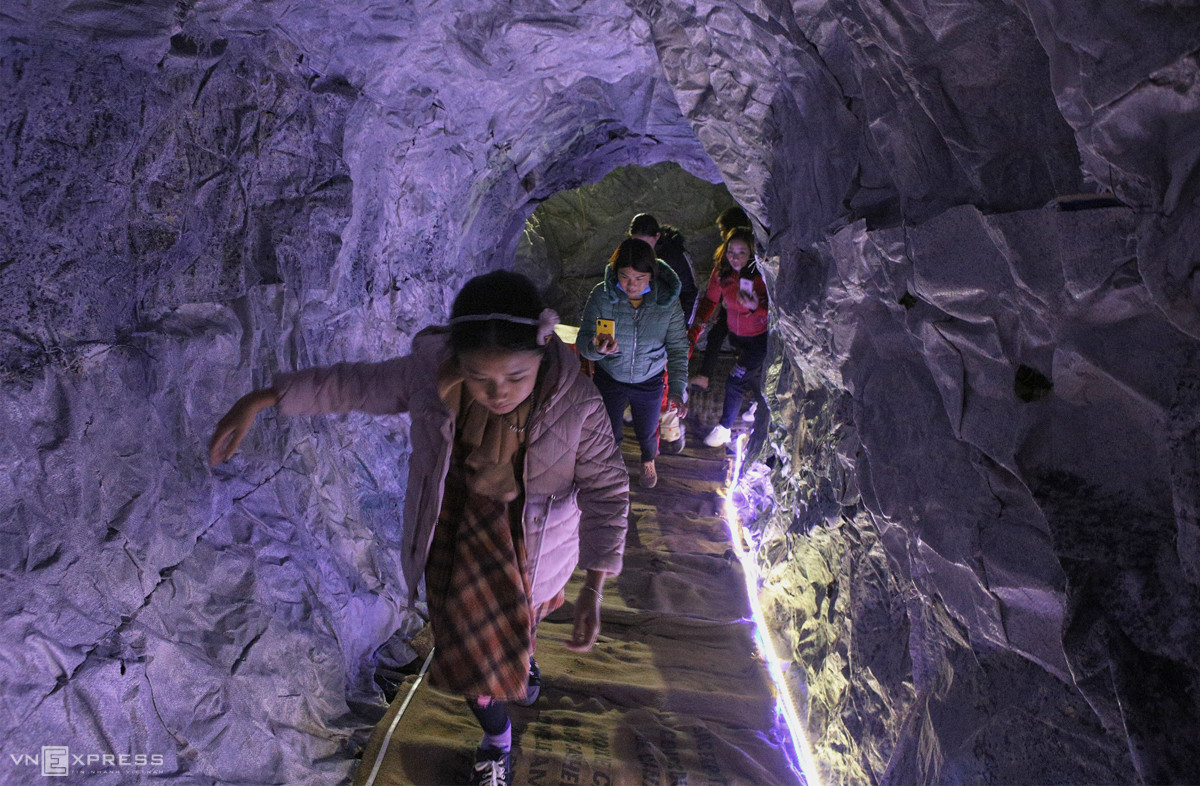 Đường hầm rộng 1m, cao 2m, nền lát bằng cây mét phủ vải để tránh trơn trượt. Hai bên hành lang đường hầm là bóng điện nháy và đèn cao áp để phối cảnh.