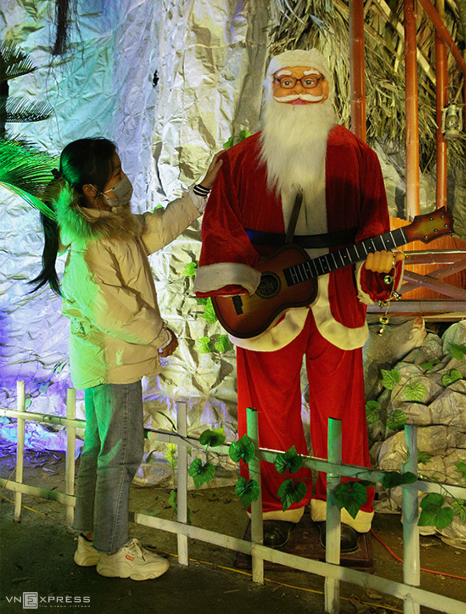 Nguyễn Thị Mai Hương, 13 tuổi, chăm chú bên bức tượng ông già Noel ở chân hang đá. "Em từng được bố mẹ đưa đi chơi nhiều nơi vào dịp Noel mỗi năm, nhưng lần đầu tiên được chiêm ngưỡng hang đá khổng lồ, trang trí lộng lẫy như nơi này", Hương nói.
