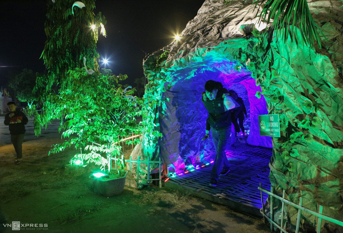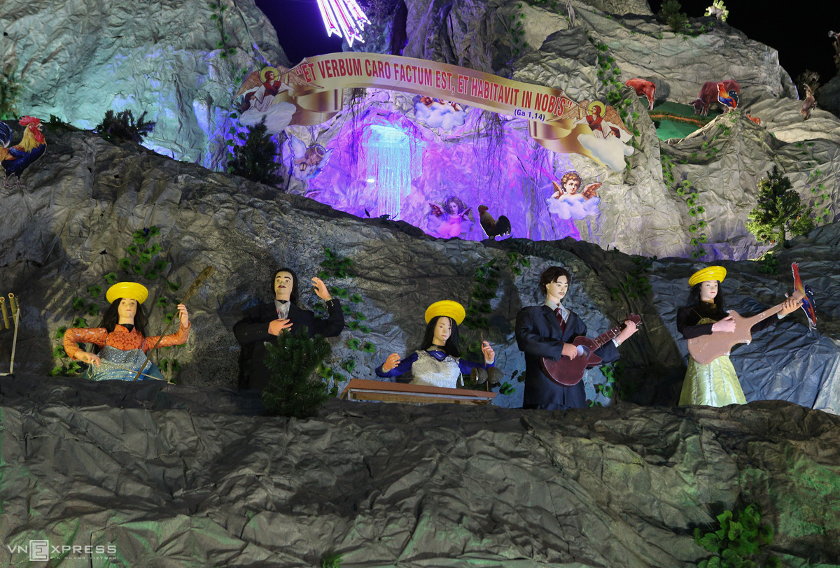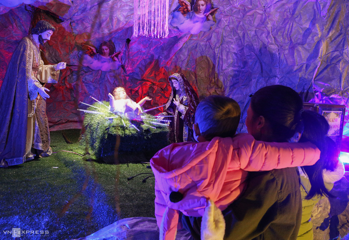 Điểm nhấn là hang Belem đặt tại tầng 2, nơi tái hiện Chúa Giêsu ra đời. "Có rất nhiều cách trang trí trong dịp này, song chúng tôi chọn hang đá với mong muốn tái hiện Chúa Giáng sinh để mọi người hiểu", ông Nguyễn Văn Nhiên (46 tuổi), thành viên Hội đồng mục vụ giáo xứ Kẻ Gai, nói.