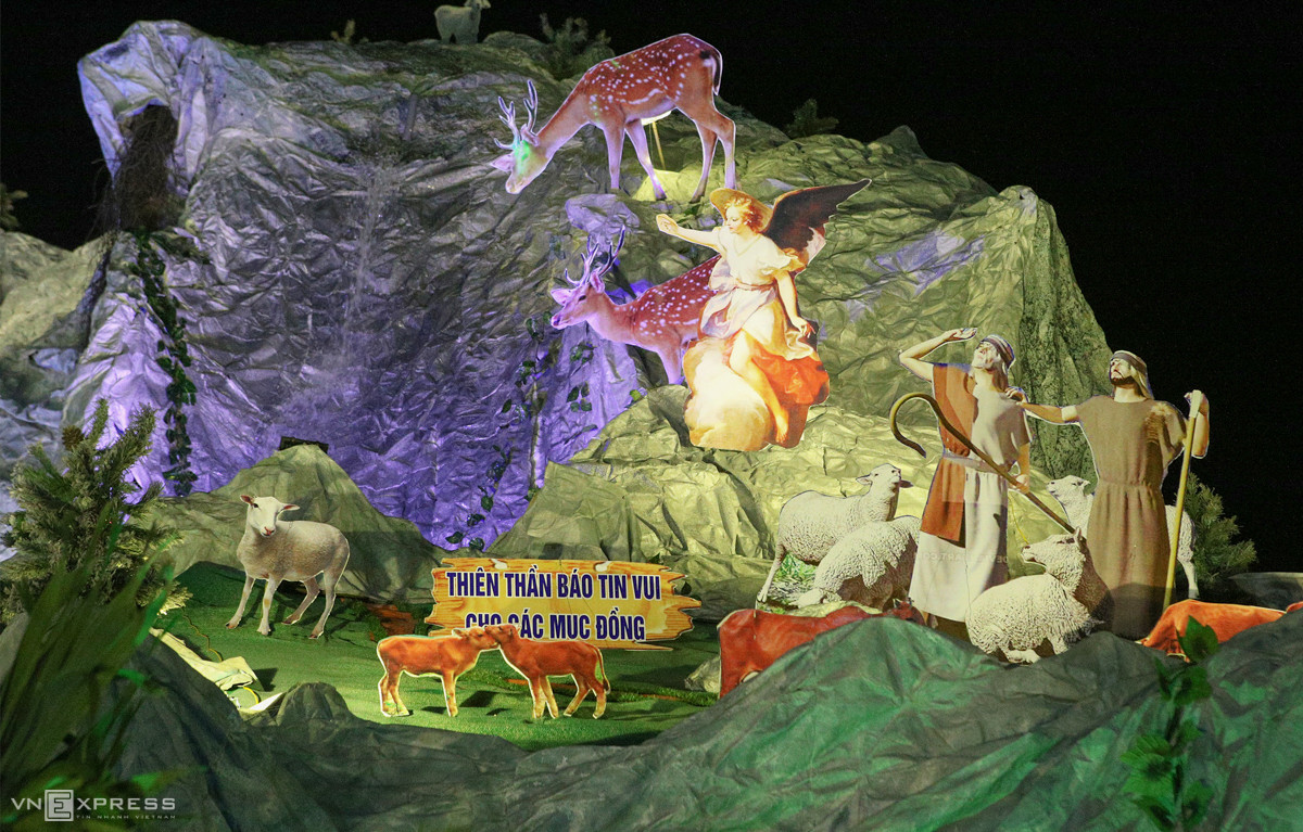 Hoạt cảnh Thiên thần báo tin vui cho các mục đồng được trang trí lộng lẫy trên các vách đá.