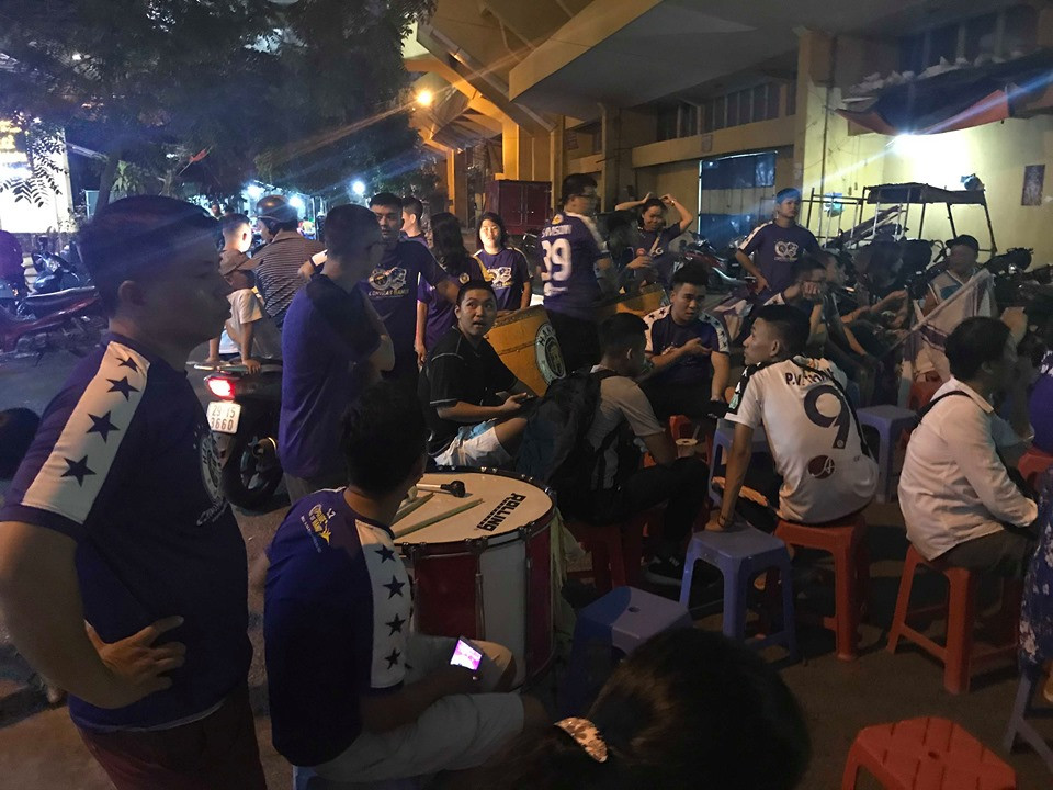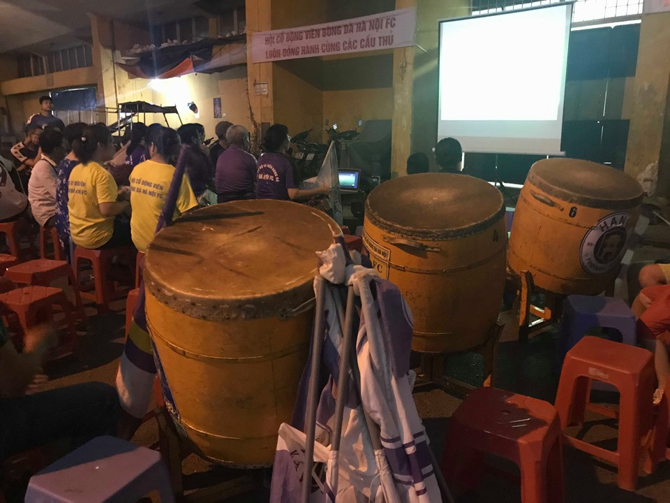 Mặc dù đứng bên ngoài sân nhưng nhóm CĐV CLB Hà Nội vẫn cổ vũ nhiệt tình với kèn trống.