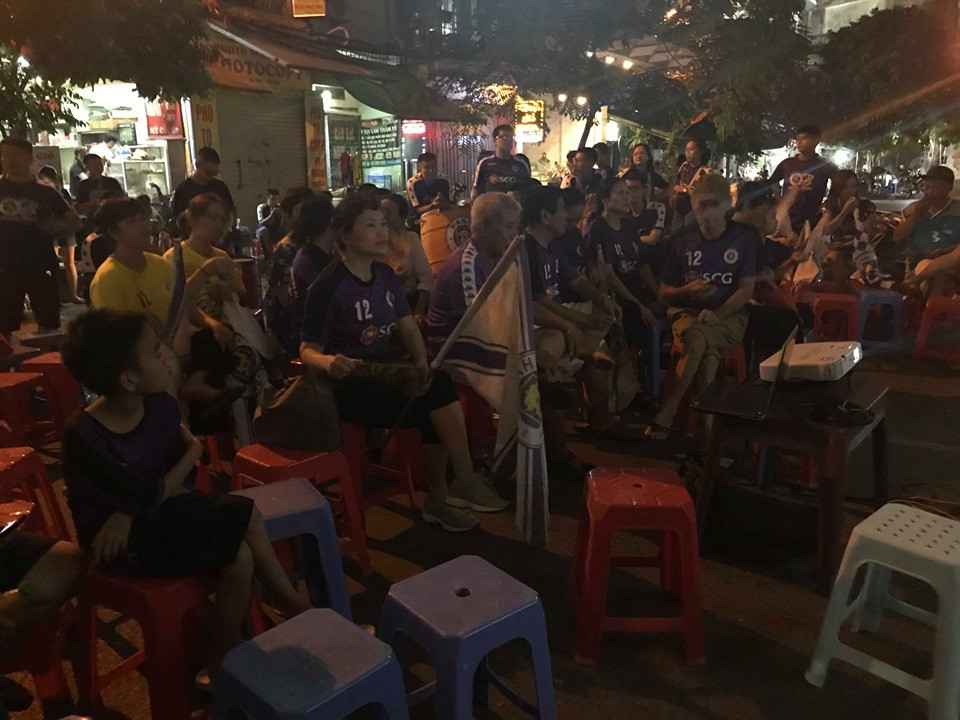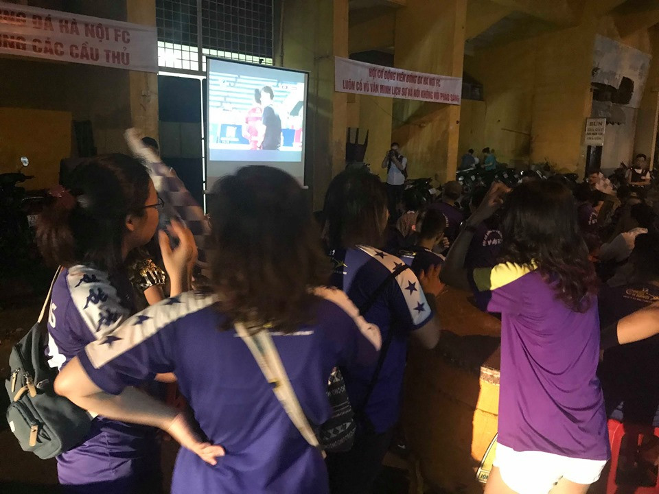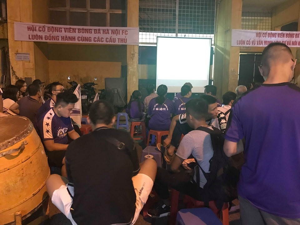 CĐV Hà Nội tụ tập ngoài sân Hàng Đẫy dựng máy chiếu để theo dõi trận đấu.