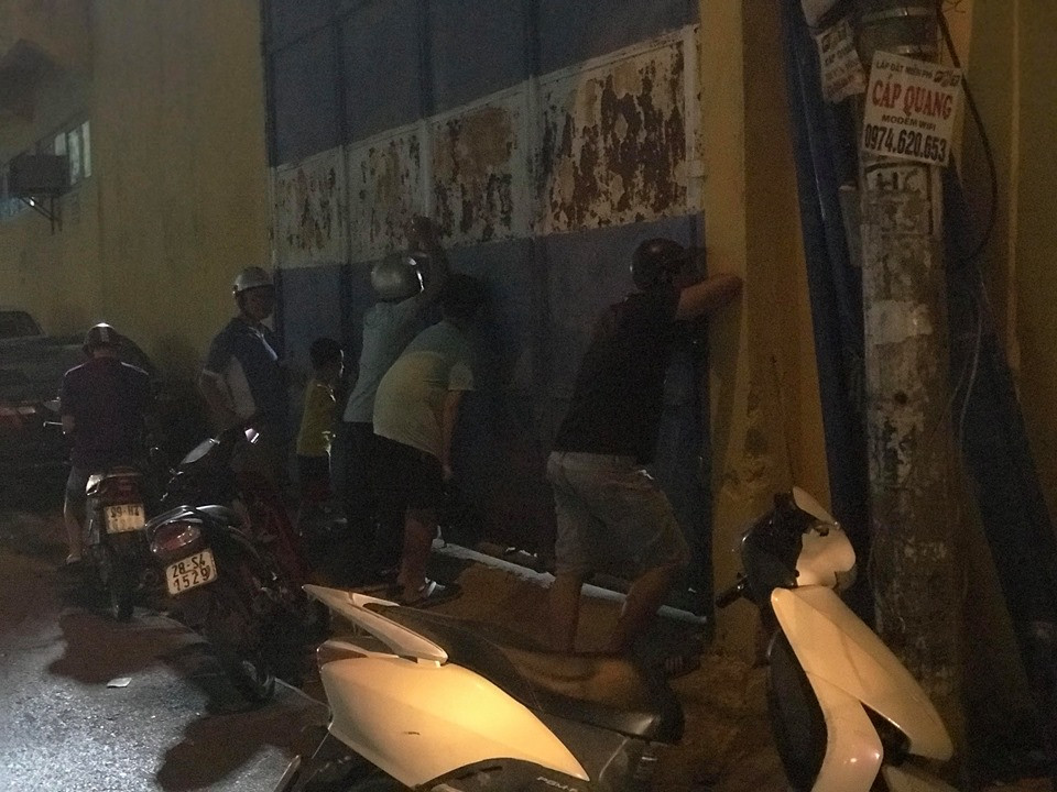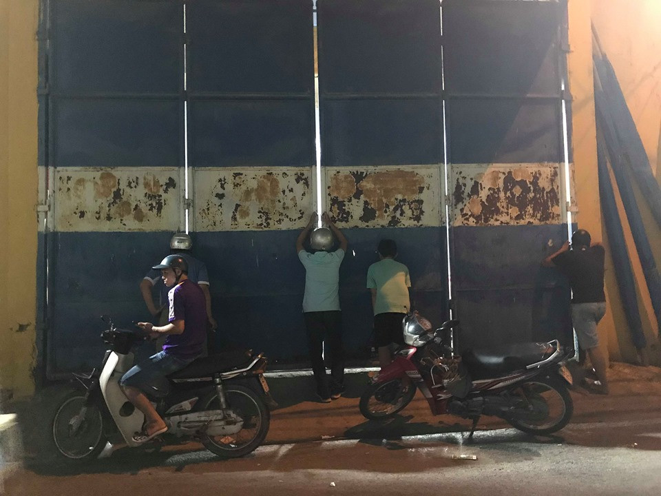 Nhiều người cố gắng nhòm qua khe cửa sân để theo dõi trận đấu.