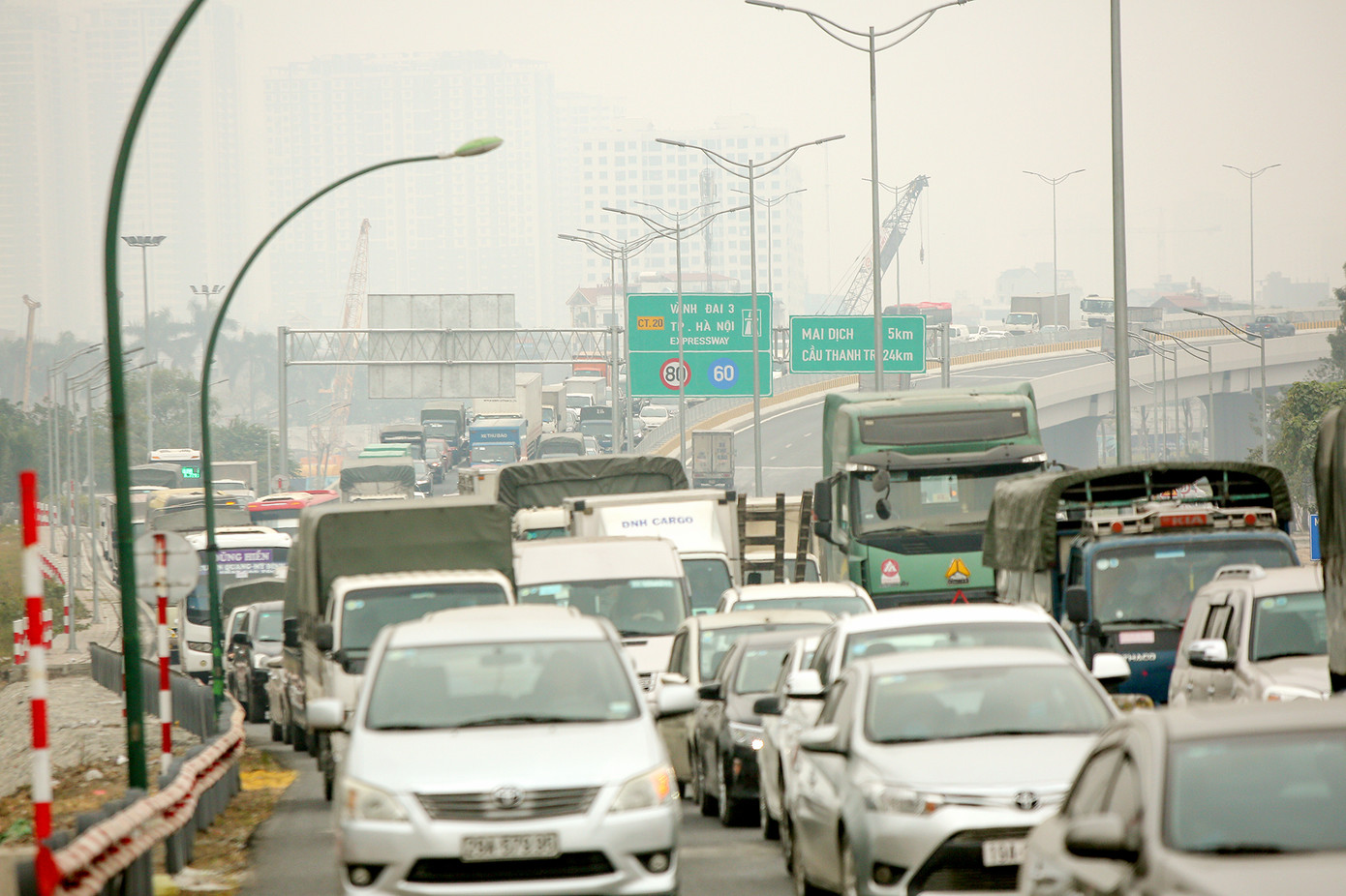 Các phương tiện nối đuôi nhau di chuyển từ vành đai 3 lên cầu Thăng Long ngày hôm nay.