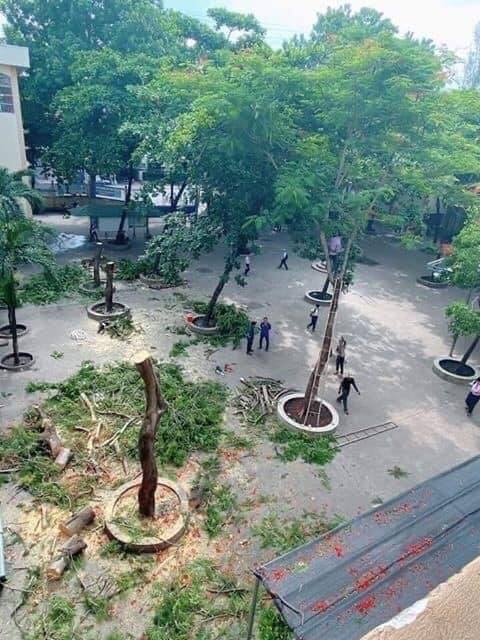 Trên mạng xã hội, nhiều người đã đăng tải hình ảnh cây phượng chỉ còn trơ gốc, đứng lẻ loi giữa sân trường rộng lớn.