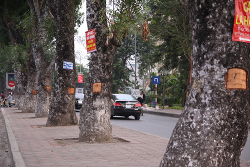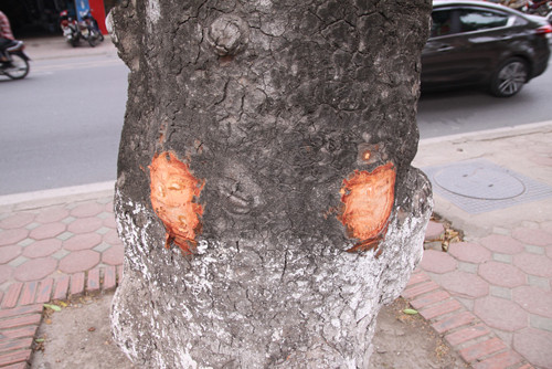 Hàng cây xà cừ trên đường Láng là một trong những hàng cây lâu năm của Hà Nội, nhiều cây to 2 người ôm, tán rộng che mát đường phố. Ngay 6/2, nhiều người dân bất ngờ phát hiện từ số nhà 954 đến 452 đường Láng có khoảng 40 cây có vết đục, khoét.